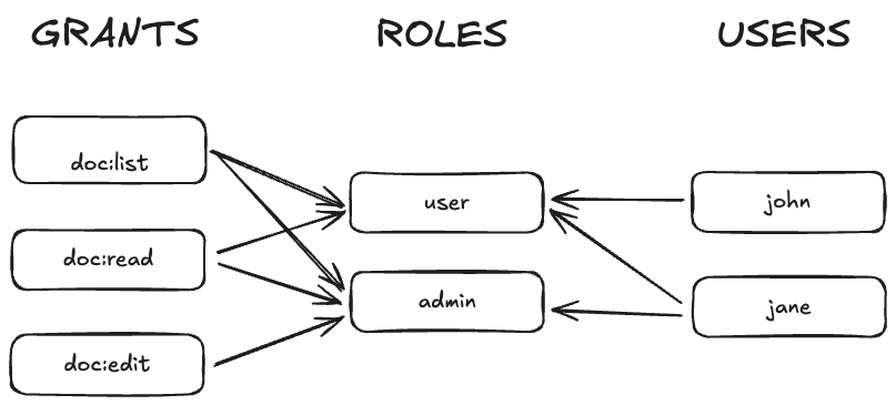 - roles: Is a group of grants, roles are assigned to users for a specific AppID